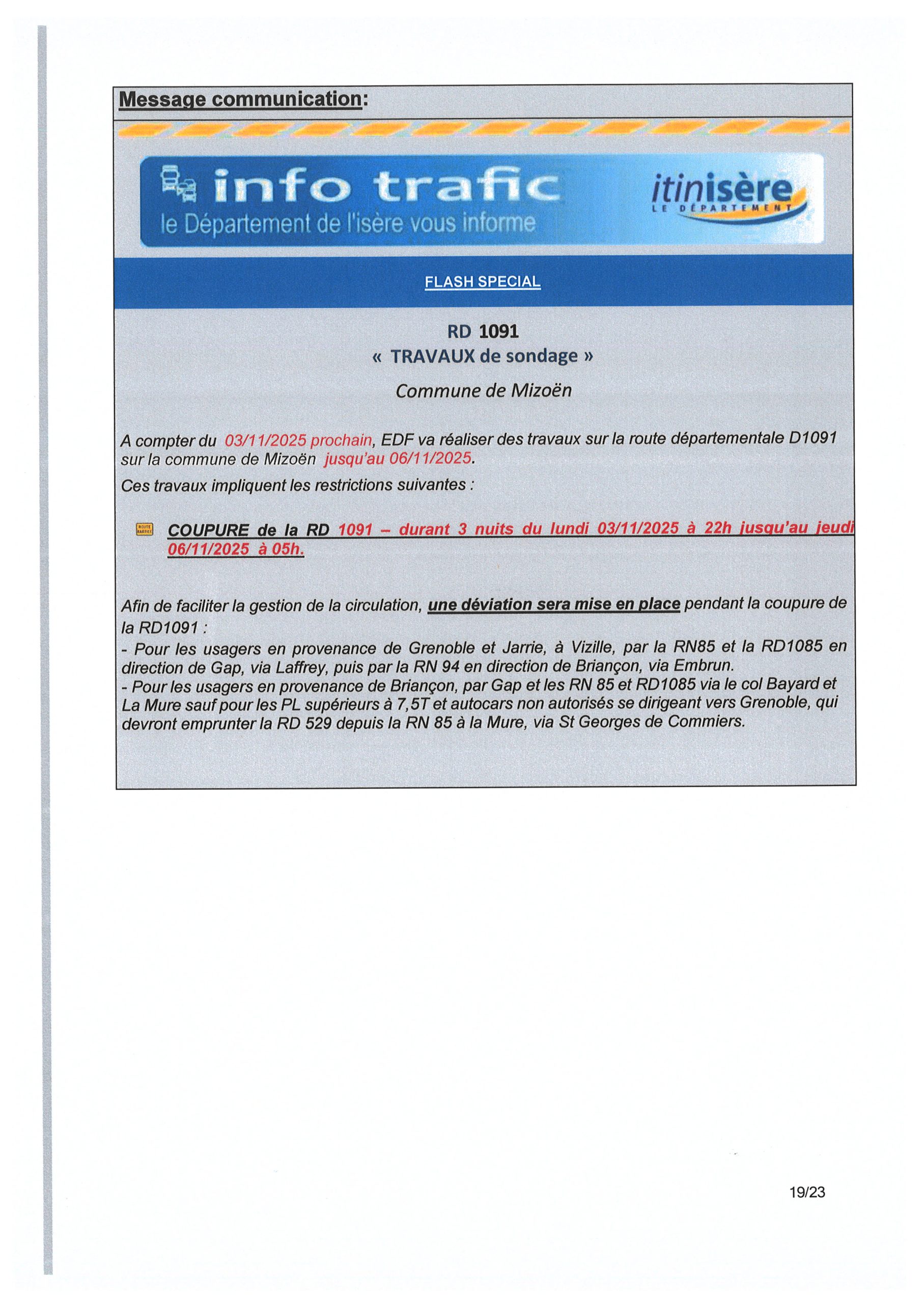 La RD1091 sera coupée durant 3 nuits du lundi 03/11/2025 au jeudi 06/11/2025 de 22h à 6h.